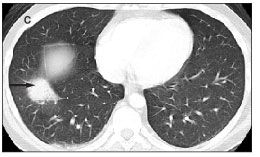 consolidation (arrows) within the lungs with peripheral area of ground-glass opacity. A: Bilateral upper lobe consolidation. B: Right lower lobe pleural-based consolidation. C: Right lower lobe consolidation.
