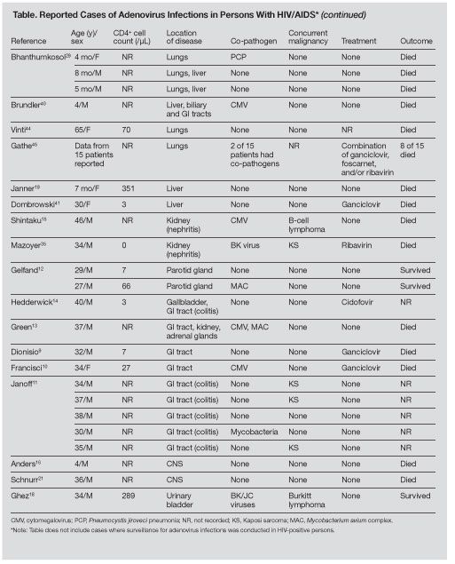 Although adenoviruses cause a wide range of clinical syndromes, respiratory,5-8 GI,9-11 and conjunctival diseases are the most common. In persons with HIV/AIDS, there are case reports of adenovirus-associated hemorrhagic cystitis, prostatitis, nephritis, hepatitis, cholecystitis, parotitis, and encephalitis.12-21