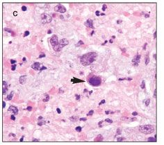 ltrate, karyorrhectic debris, and nuclear inclusions (smudge cells). The arrows identify smudge cells. C: High-power view (original magnification ×1000) of a hematoxylin and eosin (oil immersion) stain showing the infected cells with inclusions (smudge cells). The arrow identifies a smudge cell.
