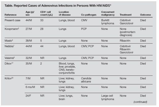 Most patients with AIDS and adenovirus infection, much like the patient presented in this case, are coinfected with other pathogens or have other complicating conditions that may contribute to their mortality risk. The most frequent co-pathogens that have been identified are CMV and P jiroveci.5,7,8,10,27,29 Two months before our patient was admitted, he was given a presumed diagnosis of cyclophosphamide-induced hemorrhagic cystitis, which may have been secondary to adenovirus infection. However, viral cultures were not obtained at that time. Obtaining the culture results is critical because there is some evidence showing that the reactivation of a latent adenovirus infection is possible.1