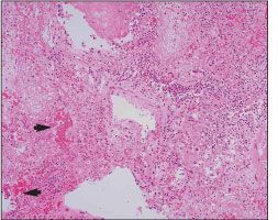 Figure 3. Lung tissue sample showing lymphocytic infiltrates as well as areas of thrombosis and hemorrhage (hematoxylin and eosin stain, original magnification ×100).