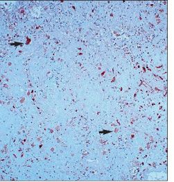 Figure 5. Lung tissue sample showing herpes simplex virus type 2 (immunohistochemical stain, original magnification ×200).