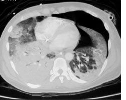 The patient was intubated in the emergency room to protect his airway. He underwent bronchoscopy with bronchoalveolar lavage on hospital day 2; all cultures, including those for bacteria, viruses, and mycobacteria, as well as those using acid-fast bacilli smear and silver stain, yielded negative results. Urinary Legionella antigen test results were also negative, as were multiple blood cultures. On hospital day 5, the patient's condition deteriorated, and a CT scan showed evidence of a left-sided spontaneous pneumothorax (Figure 2). A chest tube was inserted; however, the patient's oxygen requirements continued to increase and he required a fraction of inspired oxygen of 100% with the addition of positive end-expiratory pressure. His antibiotic regimen was broadened to include piperacillin/tazobactam, vancomycin, amphotericin B, isoniazid, rifampin, ethambutol, and pyrazinamide.