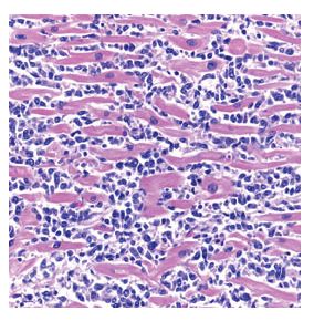 Figure 2. Anaplastic lymphoma cells can be seen diffusely infiltrating between myocytes in the heart (hematoxylin and eosin stain, original magnification ×400).