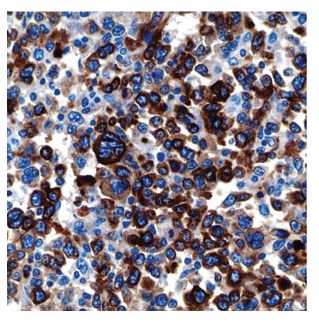 Figure 5. Lymph node effacement caused by anaplastic lymphoma cells (immunohistochemical stain for CD30, original magnification ×600).