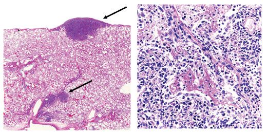 Figure 1. Left: Lymphoma nodules (arrows) are shown on the visceral pleura and in the lung parenchyma along the septum (hematoxylin and eosin stain). Right: Anaplastic lymphoma cells are seen extensively infiltrating the lung parenchyma admixed with intra-alveolar eosinophilic (pink) fibrin deposition in keeping with an exudative (acute) phase of diffuse alveolar damage (hematoxylin and eosin stain, original magnification ×400).
