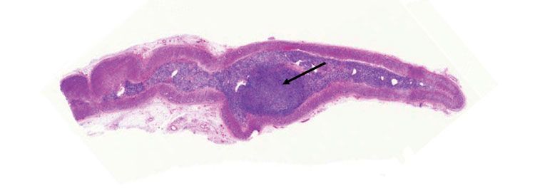 Figure 4. A large lymphoma nodule (arrow) is shown within the medulla of an adrenal gland (hematoxylin and eosin stain).