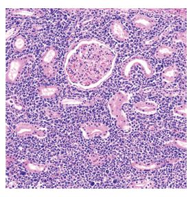 Figure 3. The kidney interstitium is densely packed with malignant lymphocytes growing between renal glomeruli and tubules (hematoxylin and eosin stain, original magnification ×200).