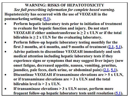 The original label approved by the FDA included a warning regarding the risk of elevated hepatic transaminase that indicated concentrations 3 times the upper limit of normal (ULN) had been observed during clinical trials of fezolinetant. It called for clinicians to evaluate hepatic function and injury before initiating treatment. Therapy was contraindicated in any person with serum transaminase levels equal to or greater than 2 times ULN.2