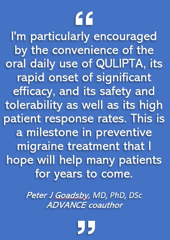 "I'm particularly encouraged by the convenience of the oral daily use of QULIPTA, its rapid onset of significant efficacy, and its safety and tolerability as well as its high patient response rates,” concluded Goadsby in the statement. “This is a milestone in preventive migraine treatment that I hope will help many patients for years to come."