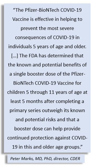 “The Pfizer-BioNTech COVID-19 Vaccine is effective in helping to prevent the most severe consequences of COVID-19 in individuals 5 years of age and older,” said Peter Marks, MD, PhD, director of the FDA’s Center for Biologics Evaluation and Research in the same press statement. “[…] The FDA has determined that the known and potential benefits of a single booster dose of the Pfizer-BioNTech COVID-19 Vaccine for children 5 through 11 years of age at least 5 months after completing a primary series outweigh its known and potential risks and that a booster dose can help provide continued protection against COVID-19 in this and older age groups.”