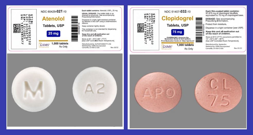 The medications involved are the ß-blocker atenolol, prescribed to reduce hypertension, and the antiplatelet agent clopidogrel, which reduces the risk of acute myocardial infarction (AMI) or stroke among patients with a history of AMI, angina, or peripheral arterial disease.