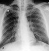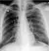 Fever and abdominal pain in man with prior stab wounds: The PA radiograph (A) reveals diffuse miliary lung nodules. There is no evidence of lymphadenopathy or pleural effusion. A chest film obtained 7 days earlier was clear.