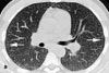 Like chest radiographs, CT scans of patients with pulmonary talc granulomatosis usually reveal a diffuse pattern of micronodules. As in the case presented here, the CT scan may show additional findings, such as ground-glass opacity and septal lines. Additional CT findings may include conglomerate masses (with the occasional presence of high-attenuation foci) and lower lobe-predominant panacinar emphysema.2 Several investigators have reported a progression of talc disease on serial imaging studies similar to the progression found in silicosis, with a diffuse fine nodular pattern progressing to upper lobe, high-attenuation conglomerate masses.2-5