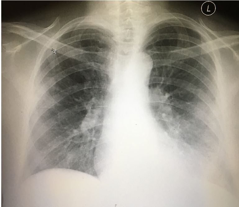 Patient's vital signs and results of physical examination are normal; results of a previous lumbar puncture also were normal. What does the chest x-ray reveal?