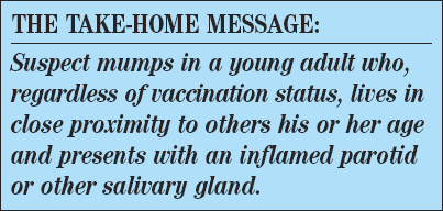 This young man has mumps, a disease recently thought to have been nearly eliminated in the United States. His symptoms fulfill the CDC case definition of mumps: acute onset of unilateral or bilateral tender, self-limited swelling of the parotid or other salivary gland that lasts at least 2 days and has no other apparent cause.1