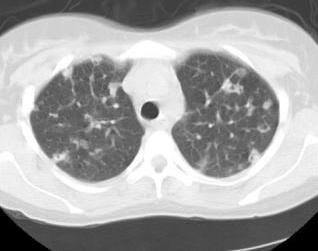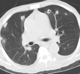 The major findings on chest CT scan are multiple pulmonary peripheral nodules of varying size with evidence of cavitation.5 Mediastinal lymphadenopathy and/or peripheral wedge-shaped densities along the pleura and hilar are also possible.6 TEE is essential to rule out right-sided endocarditis as a source.