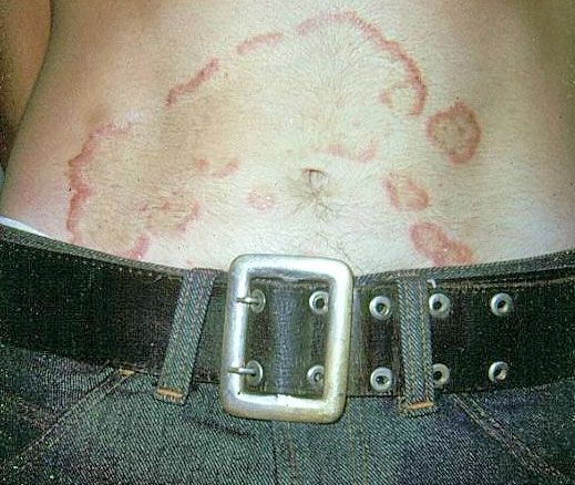 A 25-year-old man noted a gradually increasing, asymptomatic rash on the abdomen. Findings from the remainder of the cutaneous exam, including the toenails, were normal.
