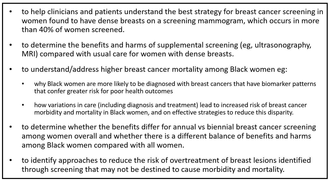 The Task Force includes a list of research needs and gaps in screening for breast cancer that includes research1: