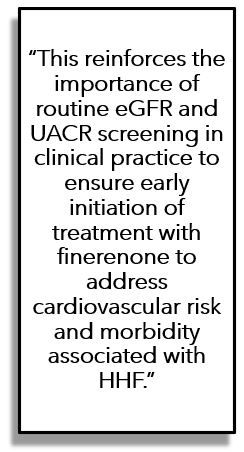 “The FIDELITY-HF analysis demonstrates the consistent benefits of finerenone on HF-related outcomes across CKD stages in patients with T2D, regardless of eGFR or UACR at baseline. This reinforces the importance of routine eGFR and UACR screening in clinical practice to ensure early initiation of treatment with finerenone to address cardiovascular risk and morbidity associated with HHF,” the investigators concluded.