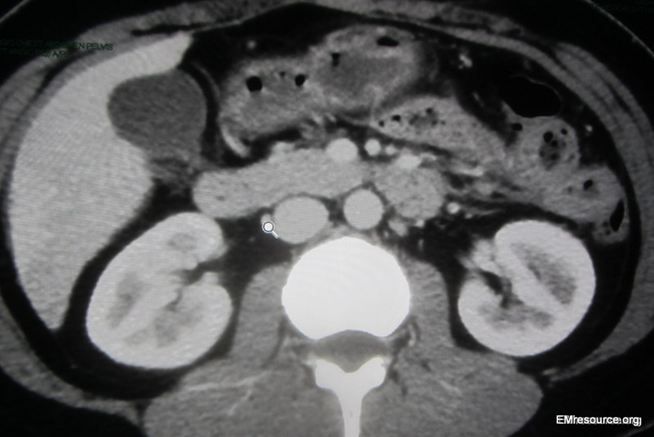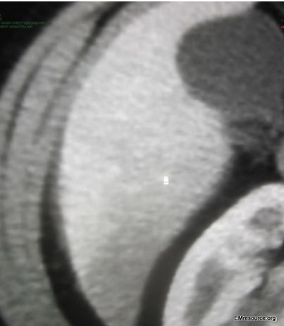 The CT scan is read by the radiologist as negative for pulmonary embolism (PE) or any other pathology. A slice of the CT is shown in the Figure 1 (click image to enalrge) and demonstrates a subtle diagnostic finding that was missed by the radiologist.