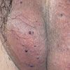 Numerous dark purple, dome-shaped papules were scattered over the scrotum. They varied in diameter from 2 to 4 mm. The physical findings were otherwise normal. Specifically, the patient had no associated varicocele or inguinal hernia. The clinical diagnosis was Fordyce angiokeratoma.