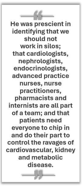 In a recent interview with Healio, Keith C. Ferdinand, MD, the Gerald S. Berenson Endowed Chair in Preventative Cardiology and professor of medicine at Tulane University School of Medicine and Healio|Cardiology Today Editorial Board Member, said he had worked with Bakris for several decades and enjoyed being on the stage with him at a major symposium where they would “banter back and forth on how best to apply the emerging data not just on hypertension but cardio-kidney-metabolic disease. He was prescient in identifying that we should not work in silos; that cardiologists, nephrologists, endocrinologists, advanced practice nurses, nurse practitioners, pharmacists and internists are all part of a team; and that patients need everyone to chip in and do their part to control the ravages of cardiovascular, kidney and metabolic disease.”