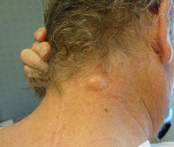 A 67-year-old man sought medical attention because of the gradual development of a “lump” on his neck. The nodule was smooth-surfaced, non-tender, somewhat compressible, and freely movable. The surface was slightly yellowish.