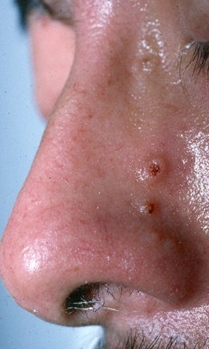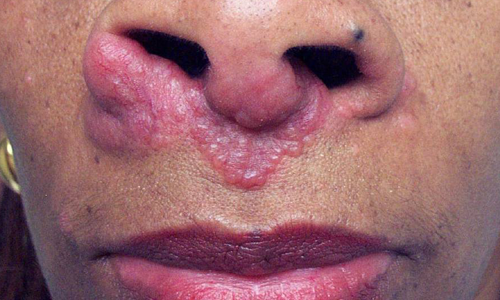 A 33-year-old African American woman presents with asymptomatic, slowly expanding, firm, reddish purple plaques at the distal nose and within the nasal septum. Her only additional complaint is dyspnea on exertion.
