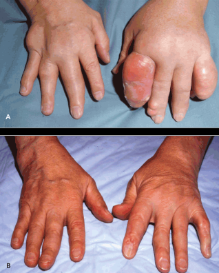 Figure A depicts the hands of a patient with severe tophaceous gout. Figure B depicts the patient’s hands after 7 years of treatment with allopurinol and probenecid to maintain his serum urate level at 4 mg/dL. Even the largest tophi may be dissolved with use of appropriate medication and with sufficient patient adherence.
