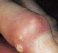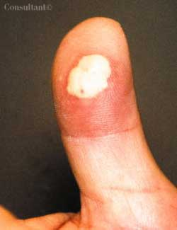 This white lesion on the thumb of a 70-year-old man is surrounded by erythema. Analysis of fluid extracted after the lesion was lanced revealed negatively birefringent urate crystals, which confirmed a diagnosis of gout. Results of blood tests showed a serum uric acid level of 8.5 mg/dL (normal, 3.5 to 7.2 mg/dL). Monoarthritis is the classic presentation of gout (70%); polyarthritis is seen occasionally; nonarticulation sites, as seen in this case, are involved only rarely.
