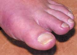 The first metatarsophalangeal joint of this patient’s left foot was erythematous, hot, and tender. He could not bear weight on the foot. The intense pain of this, his third epidsode of gout, was resistant to treatment with colchicine. Read the full case.