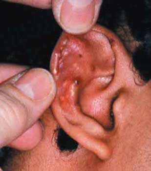 The inflammation of the pinnae and bone-colored, asymmetrical, superficial lesions in the helix of the ear shown in the photograph below were seen in a 33-year-old man who also presented with joint pain and general malaise of 2 weeks duration. The opposite ear was similarly affected. The patient’s serum uric acid level was elevated, and joint aspiration revealed uric acid crystals. Radiographs of the joints showed no erosion. His grandfather had been treated for gout.