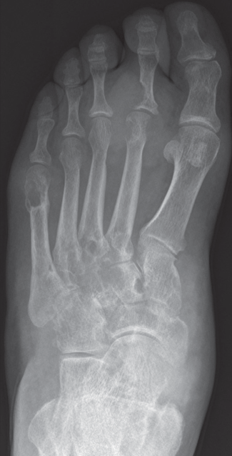 Recurrent acute gout attacks may lead to changes in joint structure visible on plain radiographs. In the x-ray film of the foot below, note the large radiopaque tophus over the second metatarsophalangeal joint and the periarticular punched-out erosions along the long axis of the bone, with overhanging edges and sclerotic rims. Joint space is generally very well preserved until late in the course of disease.
