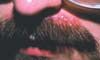 For several weeks, a 34-year-old man has been bothered by an acneiform eruption in his mustache. He has seasonal allergies, for which he uses a corticosteroid nasal spray and an oral nonsedating antihistamine. He is otherwise healthy.