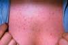 Two days earlier, a pruritic acneiform rash erupted on the face, scalp, and upper trunk of a 28-year-old man. The patient has a low-grade fever. He is otherwise healthy and has not taken any new medications.