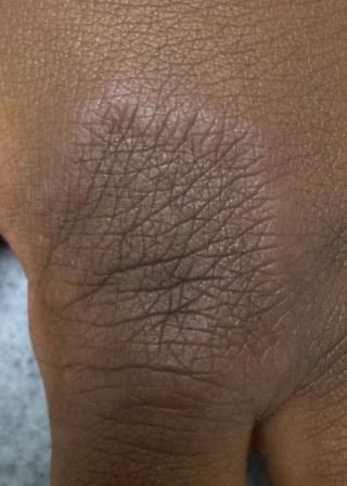 Treatment: After discussing the diagnosis of localized granuloma annulare and treatment options with the patient’s mother, she elected to monitor the lesion and return for periodic checkups, with the option to apply treatment with a medium-potency topical corticosteroid if the lesion were to continue to expand.