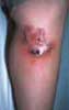 A 43-year-old woman has been bothered by an enlarging, painful plaque for2 weeks. Treatment with cephalexin and amoxicillin-potassium clavulanatewas unsuccessful. The patient also reports mild joint aches and low-gradefever. Her white blood cell count is somewhat elevated, with a slight leftshift.
