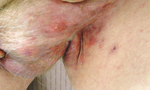 An older, obese patient with diabetes presents with intense itching and burning in the groin and on the scrotum.