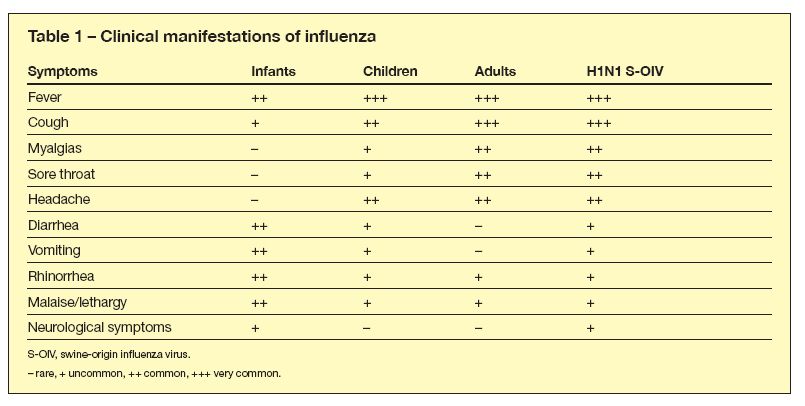 The clinical manifestations of influenza differ by patient age and by viral strain. The presenting triad of cough, fever, and myalgias is typical of disease in adults and may be accompanied by ancillary symptoms, such as headache, sore throat, and rhinorrhea (Table 1).