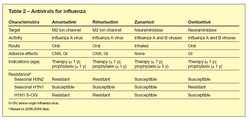 Two classes of antivirals are licensed for the prevention or treatment of influenza (Table 2).