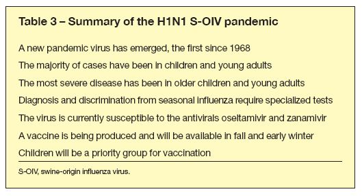 A novel H1N1 influenza virus has emerged from swine and is causing a worldwide pandemic. Children and young adults have been most affected, both in terms of numbers of cases and severity of disease. Perhaps the most striking feature of the pandemic so far is that fewer than half of those hospitalized or killed by this virus have had identifiable prior medical conditions or risk factors. Diagnostic and treatment options for infections with the H1N1 swine-origin influenza virus (S-OIV) continue to change as the pandemic progresses. H1N1 S-OIV is resistant to the adamantanes, but it is sensitive to neuraminidase inhibitors. Preparations for production and distribution of a vaccine against the H1N1 S-OIV are under way, but the vaccine's efficacy and the timing of its availability in relation to the peak of the pandemic remain uncertain.