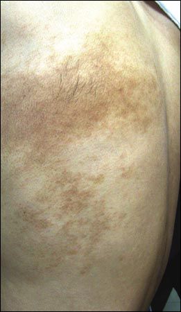 This asymptomatic, hyperpigmented lesion was first noted 5 years earlier on the left upper back of a 16-year-old boy. A nevus? Cafe au lait spot?
