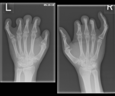 Figure 2. Radiographic images of the patient’s hands showed an absence of the middle and  distal second, third, and fourth phalanges with tapering proximal phalanges and  tapering of the distal fifth phalanx and distal first phalanx.