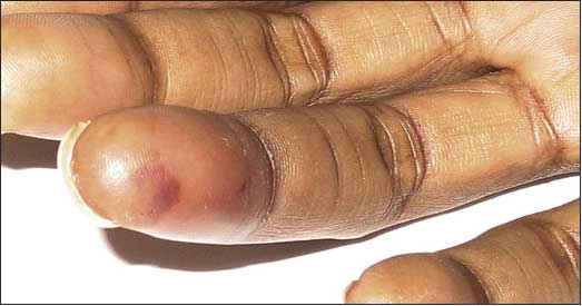 A 41-year-old woman had pain in the pulp of her fingers and dorsa of her feet. A purplish red maculopapular lesion was noted on the pulp of her finger and was identified as an Osler node.