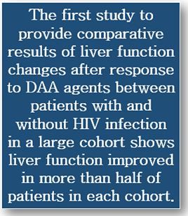The first study to provide comparative results of liver function changes after response to direct-acting antiviral (DAAs) agents between patients with and without HIV infection in a large cohort shows liver function improved in more than half of patients in each cohort. The results were published in the January 2019 issue of Journal of Viral Hepatitis.