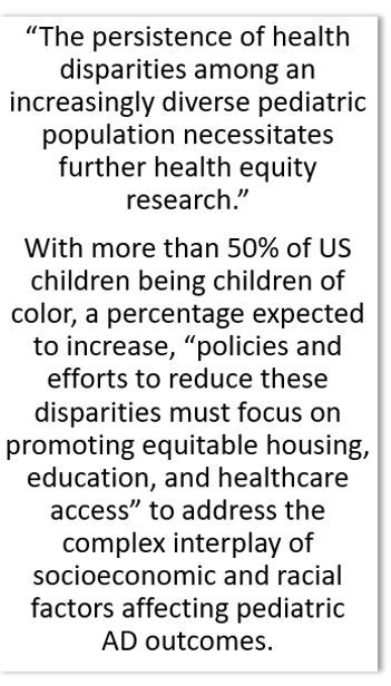 "The persistence of health disparities among an increasingly diverse pediatric population necessitates further health equity research," the authors conclude. With more than 50% of US children being children of color—a percentage expected to increase—they stress that "policies and efforts to reduce these disparities must focus on promoting equitable housing, education, and healthcare access" to address the complex interplay of socioeconomic and racial factors affecting pediatric AD outcomes.