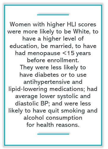 Peila et al reported that during a median follow-up of 20.1 years, there were 3821 documented cases of a first CVD event. They found that women in the higher quintiles of HLI scores compared to those in lowest quintiles were at lower risk for incident CVD overall with hazard ratios (HR) as follows: quintile 2, HR 0.74; 95% CI, 0.67-0.81; quintile 3, HR 0.66; 95% CI, 0.6-0.72; quintile 4, HR 0.57; 95% CI, 0.51-0.63; quintile 5, HR 0.48; 95% CI, 0.43-0.54 (P for trend <.001).