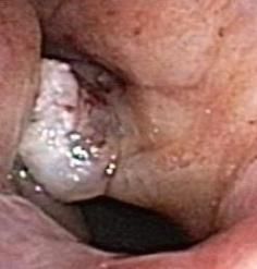 A 61-year-old man with an 80 pack-year smoking history and a past medical history of arthritis presented with hoarseness, dyspnea, and cough productive of blood-streaked sputum, all of several weeks’ duration. Findings from the physical examination were unremarkable.