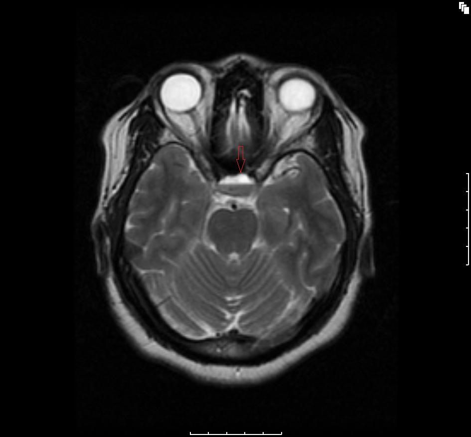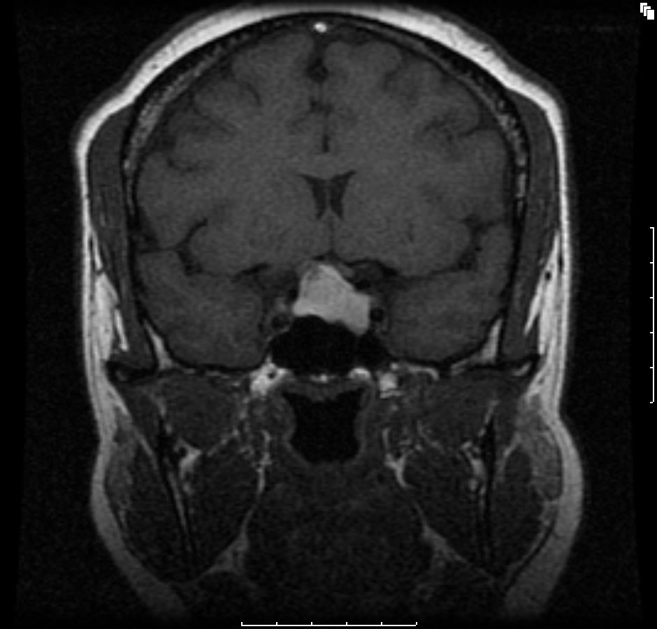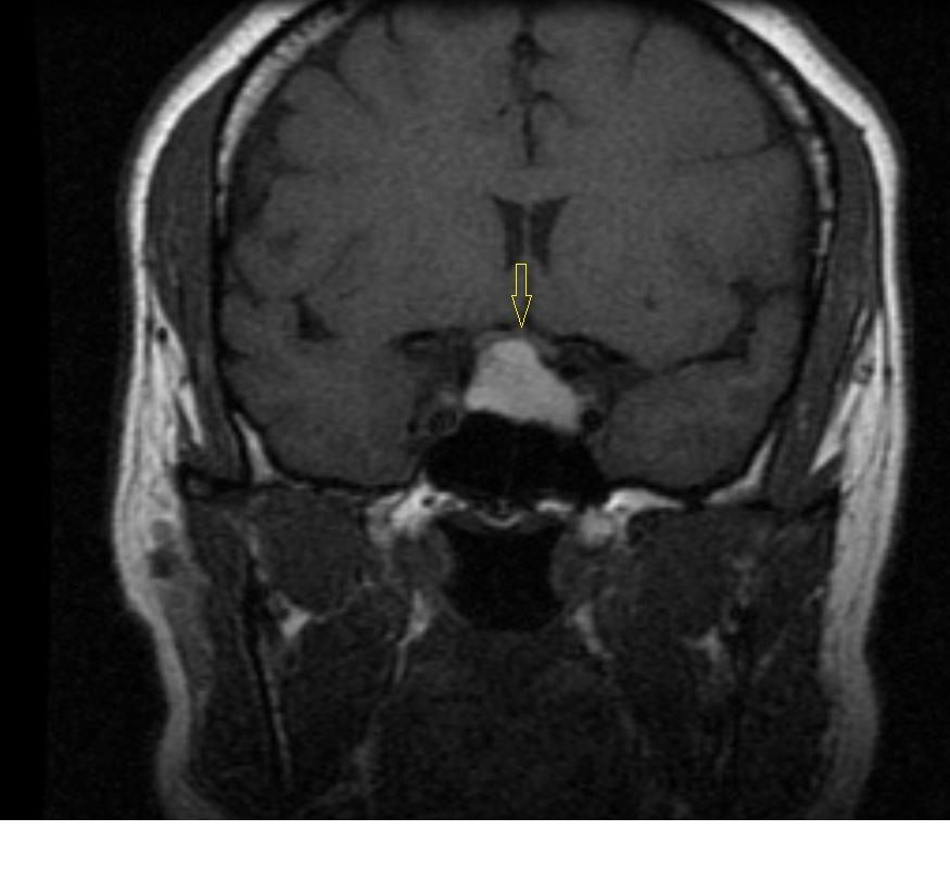 Figure A1. Coronal T1-weighted image showing hyperintense pituitary macroadema, 2.2 x 1.8 x 1.5 cm (arrow), consistent with hemorrhagic pituitary macroadema. Note extension into left cavernous sinus abutting on left internal carotid artery and deforming optic chiasm.
